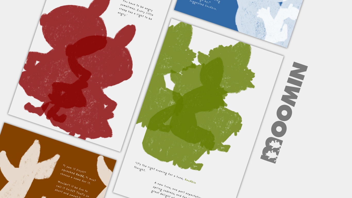 Drawing from main characters on the show, this brand explores the conceptualization of comfort and whimsical Finnish folklore through color choice, typography, and layout, ultimately capturing the charming nature of a childhood favorite show.